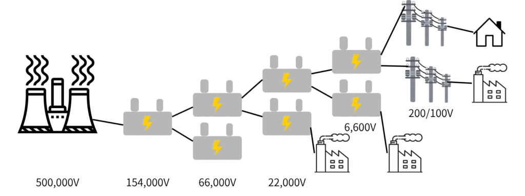 高い電圧で送電し、途中の変電所で段階的に電圧を下げながら配電しています。