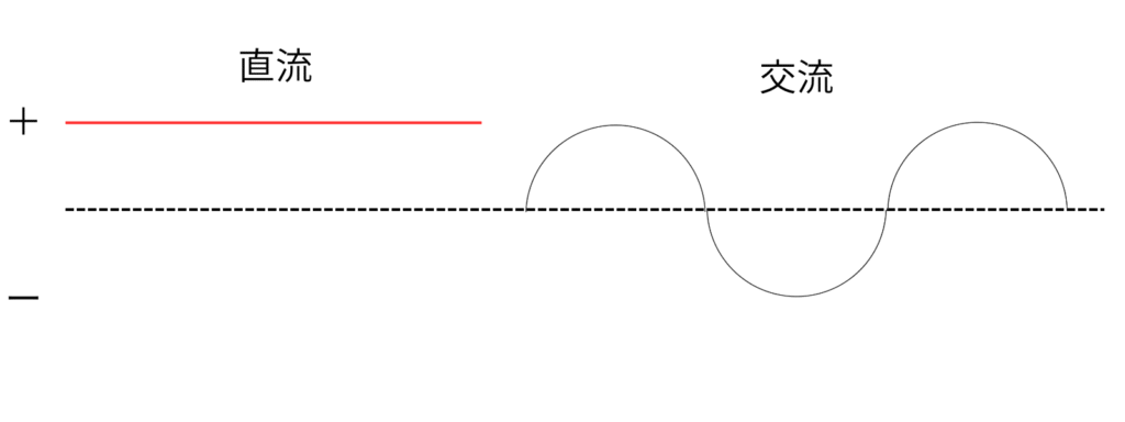 直流とは、電圧が一定でプラスとマイナスが変わらない電気のことです。